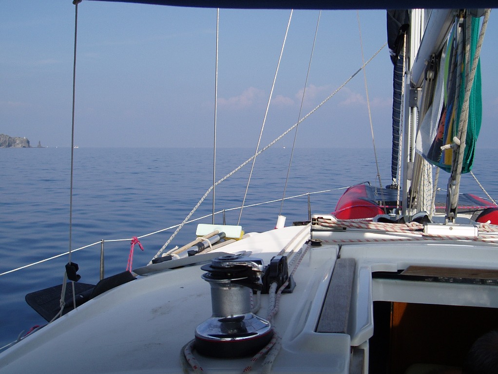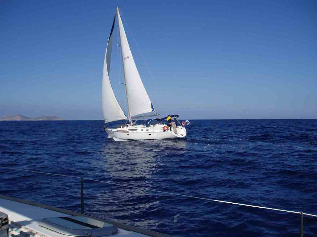Ο αέρας λιγοστός και κατάπρυμος, και έτσι ταξιδεύουμε με μηχανή και ταχύτητα 6,5 κόμβους. Κατεύθυνση η Ψέριμος όπου θα κάνουμε την πρώτη διανυκτέρευση. Αφού καβατζάρουμε τον Κάβο της Κω και νετάρουμε από την ξέρα βάζουμε πορεία Βορά και ανοίγουμε και τη μαΐστρα. Ο αέρας περίεργος, δεν έχει σταθερή κατεύθυνση αλλά κάποια στιγμή δυναμώνει σε 3-4Β. Σηκώνουμε και τη τζένοα και αναπτύσσουμε λίγο ταχύτητα αλλά οι 2Β με πιο καλό σκαρί, μας προσπερνάνε αυτοκρατορικά.
