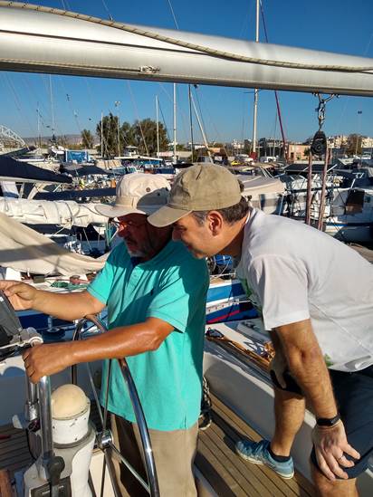 Εκεί υπήρχε ένας τελείως διαφορετικός κόσμος. Οργασμός εργασιών…. Άλλος έτρεχε, άλλος έψαχνε το σκάφος, άλλος μετέφερε νερά και φαγητά, άλλος πείραζε το γείτονά του…. Μπερδευτήκαμε στην αρχή, αλλά βρήκαμε με τη δεύτερη το σκάφος, ένα όμορφο και καλοδιατηρημένο ιστιοπλοικό. Χαιρετάμε τον καπετάνιο (Μπάμπη) και τον ύπαρχο (Βασίλη). Εμείς αναλαμβάνουμε το ρόλο του τζόβενου (παιδί για όλες τις δουλειές)…. Και χωρίς … αποζημίωση….