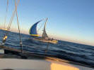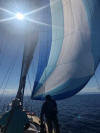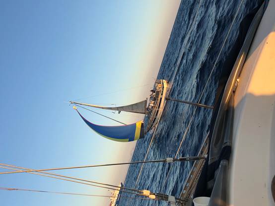 Κάποια στιγμή είπαμε να σηκώσουμε και μπαλόνι… Τι τα θέλαμε τα μεγαλεία… Τελικά σηκώθηκε αλλά δεν φάνηκε να βοηθάει και πολύ. Με το μπαλόνι μας πέρναγε σας σταματημένο ένα σκάφος με τα πανιά… Τι κάνεις και πας έτσι τον ρωτάει ο καπετάνιος μας…. Φταίει που έχεις πολύ και … γεροδεμένο πλήρωμα, απαντάει αυτός!!!! Η αλήθεια είναι ότι αυτοί ήταν δύο ενώ εμείς τέσσερεις, σχολιάσαμε εμείς… (για τις κοιλιές μας δεν υπήρξε σχόλιο). Λίγο αργότερα μαζέψαμε και το μπαλόνι.