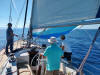 Και να που βρισκόμαστε πλέον στο ανοιχτό πέλαγος, μετά την πρώτη ώρα της προσαρμογής, όπου πλέον όλα είναι στη θέση τους και εμείς έχουμε χρόνο να παρατηρήσουμε, να συζητήσουμε, να ακούσουμε τη μουσική που παίζει… Αφού βάλουμε για μια ακόμα φορά αντηλιακό, γίνεται και η ερώτηση στον καπετάνιο, που θα μας συντροφεύσει ως αστείο, στο υπόλοιπο του ταξιδιού: “πόση είναι η αποζημίωση για το πλήρωμα;”.
