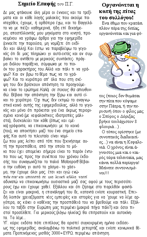 Μπήκαμε ήδη στον 8ο χρόνο της ύπαρξης (!) του συλλόγου. Και όσο περνάει ο καιρός ωριμάζουμε όλο και περισσότερο. Αυτό έχει δημιουργήσει κάποιες αν μη τι άλλο, περίεργες καταστάσεις που θα πρέπει δυστυχώς να στηλιτεύσουμε με δριμύτητα. Παραθέτω κάποιες ενδεικτικά και θα επανέλθω σε επόμενο φύλλο: Α) Έχει διαπιστωθεί, ότι όταν κάποιος έχει σκοπό να κάνει μια εκδρομή, με κανένα τρόπο δεν το ανακοινώνει στους άλλους, και ειδικά σε ορισμένου. Αυτού του είδους η δεισιδαιμονία δεν είναι αποδεκτή σε νέους και μορφωμένους ανθρώπους! Το ότι σε κάποιες περιπτώσεις στο παρελθόν μερικοί έχασαν το καράβι, ή είχαν κάποια ατυχήματα λόγω κατόπιν της ανακοίνωσης του ταξιδιού τους σε άλλους, μόνο τυχαίο μπορεί να χαρακτηριστεί! Β) Εθεάθη μέλος του συλλόγου σε έκθεση μοτοσυκλέτας να ξερογλείφεται μπροστά σε Ιταλικό δίκυκλο στο χρώμα της φωτιάς. Στη συνέχεια ρωτούσε να μάθει την τιμή δερμάτινης ολόσωμης φόρμας... Στην ερώτηση του πωλητή «για ποιον τη θέλει» τον αγριοκοίταξε και απομακρύνθηκε συνοφρυωμένος! Αντε να έρθει γρήγορα το καλοκαίρι μπας και συνέλθουμε! Ως τότε ψυχραιμία!