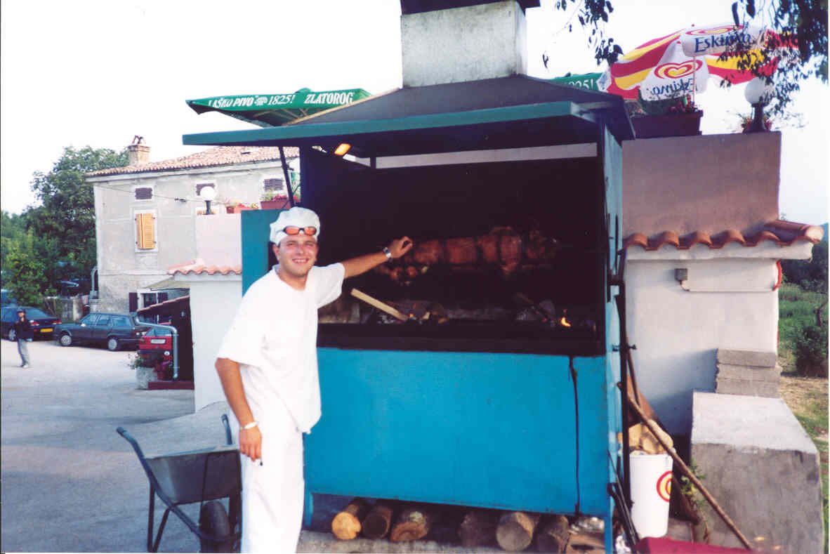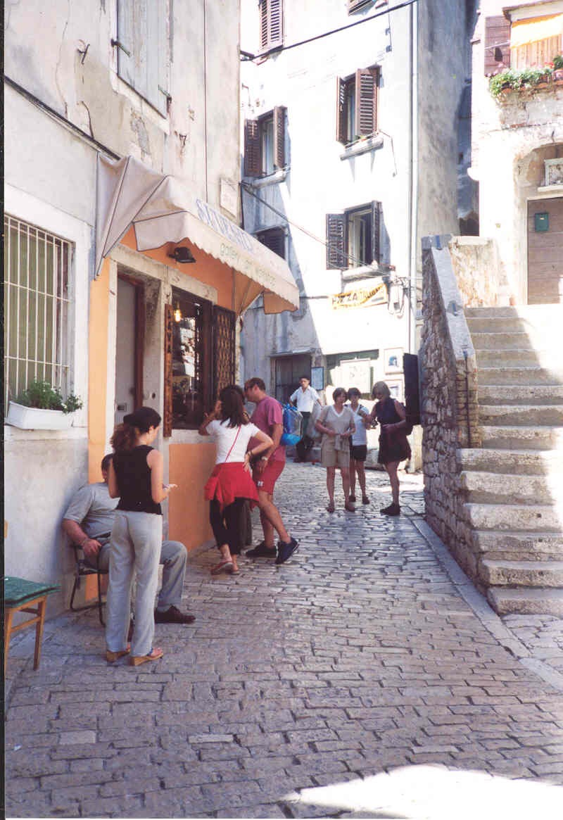 Το βράδυ θα μας φέρει στην γειτονιά της Santa Maria Formoza, της Βυζαντινής εκκλησίας του 6ου αιώνα. Δίπλα στο μέρος που ήταν κάποτε το κυρίως τμήμα του ναού και που σήμερα είναι μια αυλή, ανακαλύπτουμε το εστιατόριο HB με λίγα τραπεζάκια παρατεταγμένα στον ανοιχτό χώρο. Ο συμπαθητικός και ιδιαίτερα ομιλητικός ιδιοκτήτης που είναι ταυτόχρονα και ένα από τα δύο γκαρσόνια, θα μας κερδίσει γρήγορα με την απλότητά του αλλά και τις όμορφες γεύσεις του. Μαθαίνουμε ότι είμαστε από τους ελάχιστους Έλληνες τουρίστες που περνάνε από την Ιστρια, ότι οι Γερμανοί και οι Ιταλοί είναι από τους βασικούς εκδρομείς που επισκέπτονται την περιοχή και ότι τα τελευταία 4-5 χρόνια, έχει αρχίσει και επανακτά η περιοχή την παλιά της τουριστική αίγλη. Βέβαια οι τελευταίοι βομβαρδισμοί της Γιουγκοσλαβίας από τους Αμερικάνους, κάθε άλλο παρά βοήθησαν προς αυτή την κατεύθυνση. Όντας διστακτικός στην αρχή, μόλις κατάλαβε ότι συμμεριζόμαστε τα όχι ιδιαίτερα φιλοαμερικανικά του πιστεύω, μας κέρασε το υπόλοιπο κρασί και μας «ανάγκασε» να τον επισκεφτούμε ακόμα μια φορά τις επόμενες μέρες.