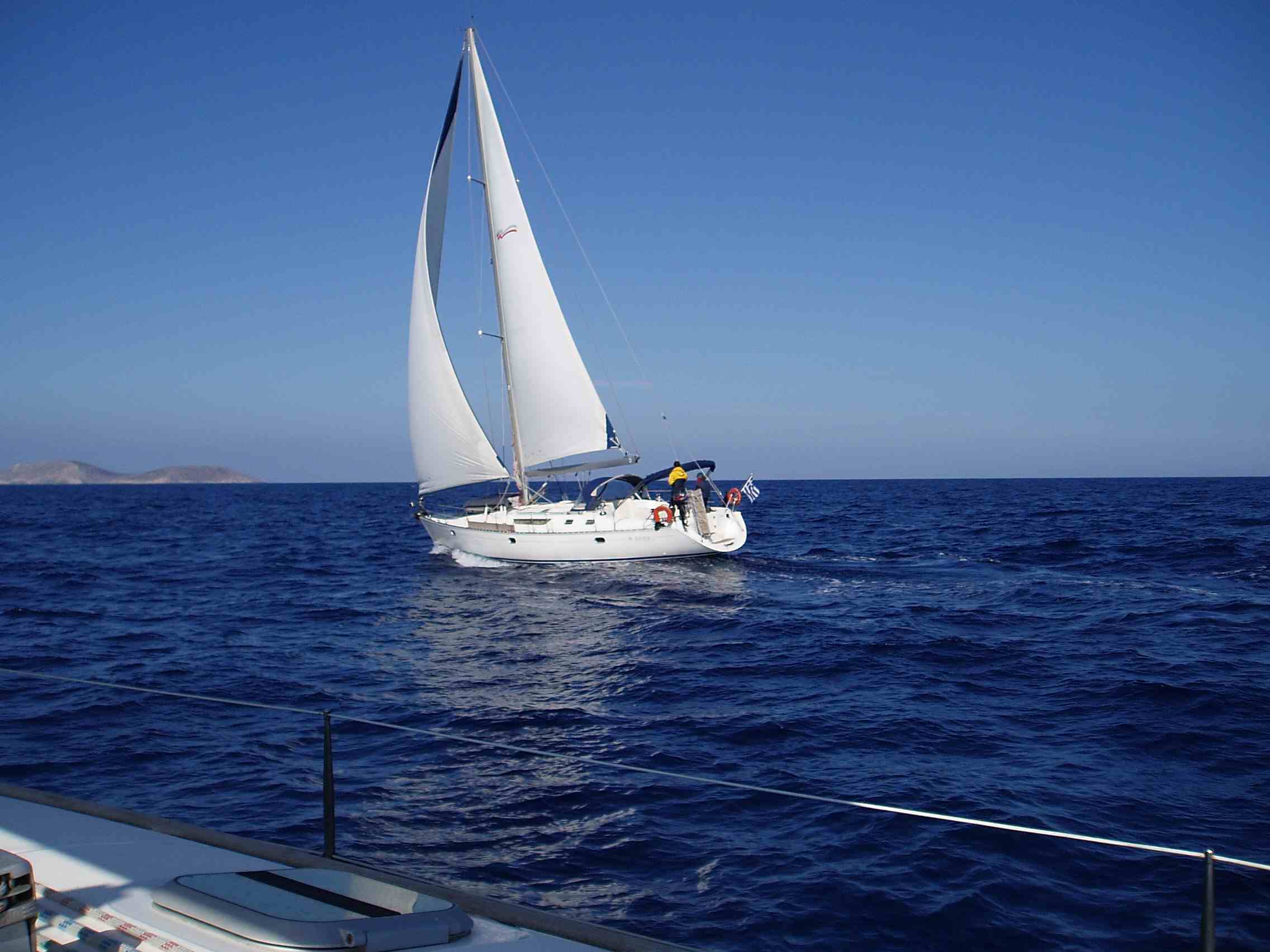 Ο αέρας λιγοστός και κατάπρυμος, και έτσι ταξιδεύουμε με μηχανή και ταχύτητα 6,5 κόμβους. Κατεύθυνση η Ψέριμος όπου συμφωνήσαμε όλοι ότι θα κάνουμε την πρώτη διανυκτέρευση. Αφού καβατζάρουμε τον Κάβο της Κω και νετάρουμε από την ξέρα βάζουμε πορεία Βορά και ανοίγουμε και τη μαΐστρα. Ο αέρας περίεργος, δεν έχει σταθερή κατεύθυνση αλλά κάποια στιγμή δυναμώνει σε 4-5Β. Σηκώνουμε και τη τζένοα, και παίρνουμε και δυο μούδες γιατί το σκάφος δεν πήγαινε καλά στα όρτσα. Οι 2Β με πιο καλό σκαρί μας προσπερνάνε αυτοκρατορικά.